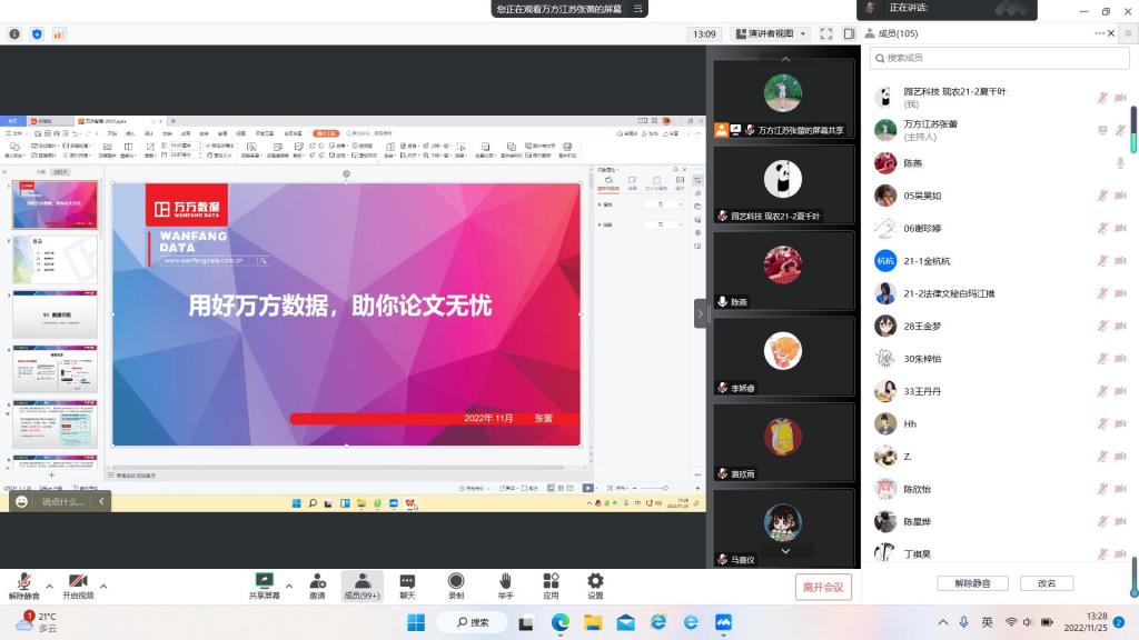 為了讓校內讀者了解圖書館的各類數字資源,并能充分利用數字資源。圖書館于2022年11月25日邀請了萬方數據公司培訓師張蕾以線上的方式為我院師生做了題為“用好萬方數據,助你論文無憂”的專題講座,100余名師生參加,講座由圖書館綜合部部長陳燕主持。