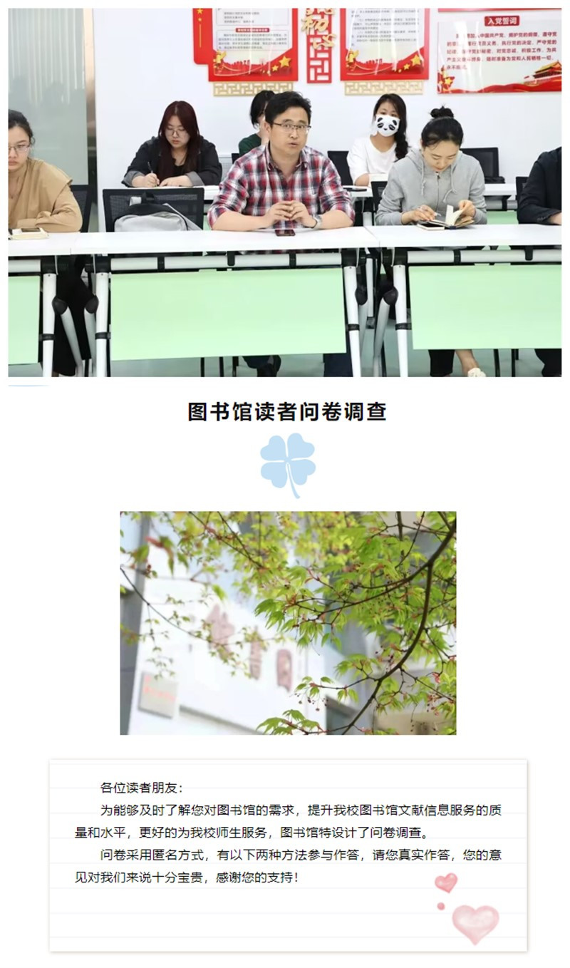為深入開展學(xué)習(xí)貫徹習(xí)近平新時(shí)代中國特色社會(huì)主義思想主題教育,充分了解師生對文獻(xiàn)服務(wù)和資源建設(shè)的意見和建議,根據(jù)《關(guān)于在學(xué)校各級黨組織和廣大黨員干部中大興調(diào)查研究的通知》,圖書館近期深入開展調(diào)研工作。