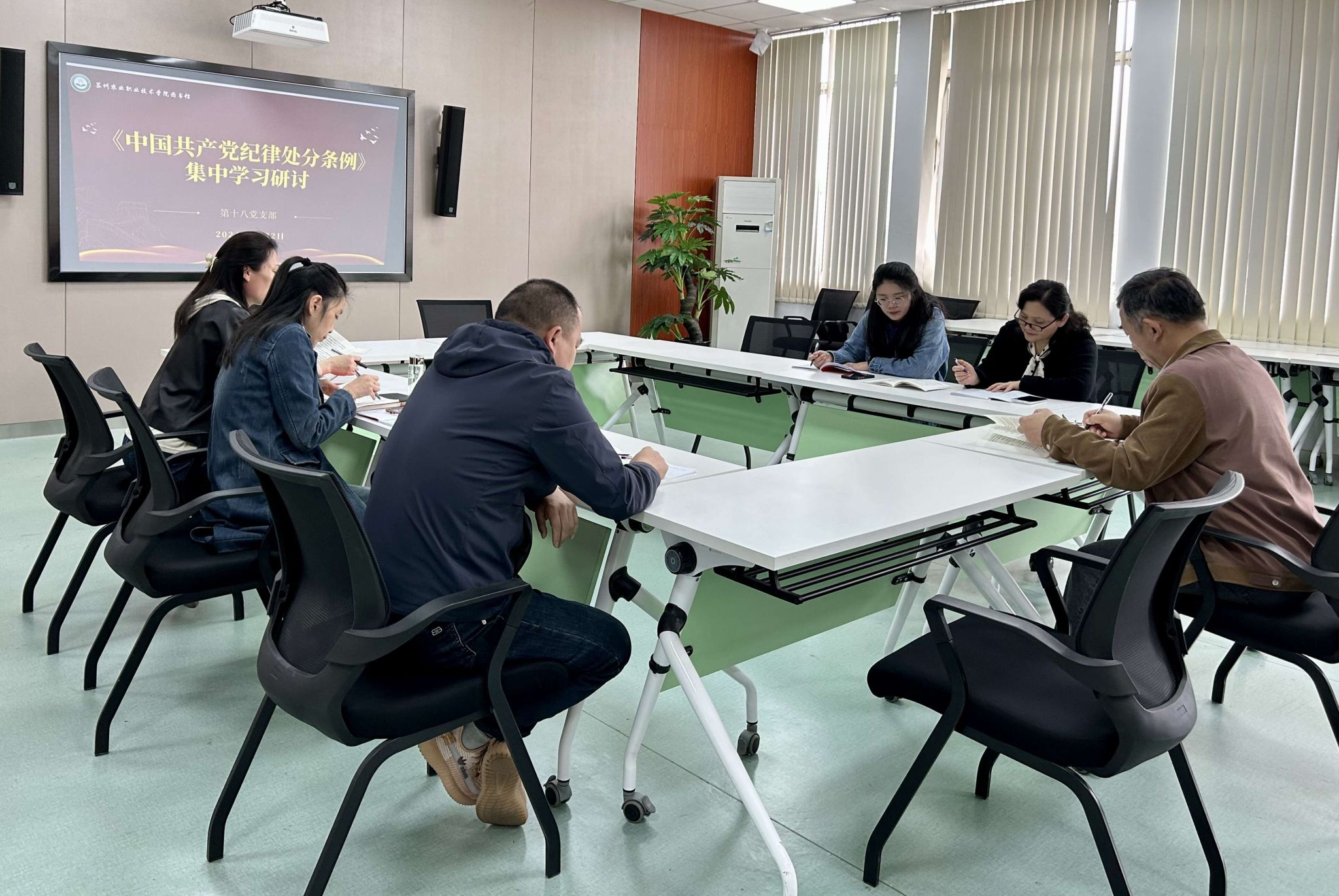為貫徹落實蘇州農業職業技術學院委員會印發的《關于在全校黨員干部中開展黨紀學習教育的實施方案》通知要求,進一步深化支部全體黨員對黨紀的認識,提高黨性修養,機關黨總支第十八黨支部于4月22日在圖書館黨員活動室召開《中國共產黨紀律處分條例》集中學習研討會。