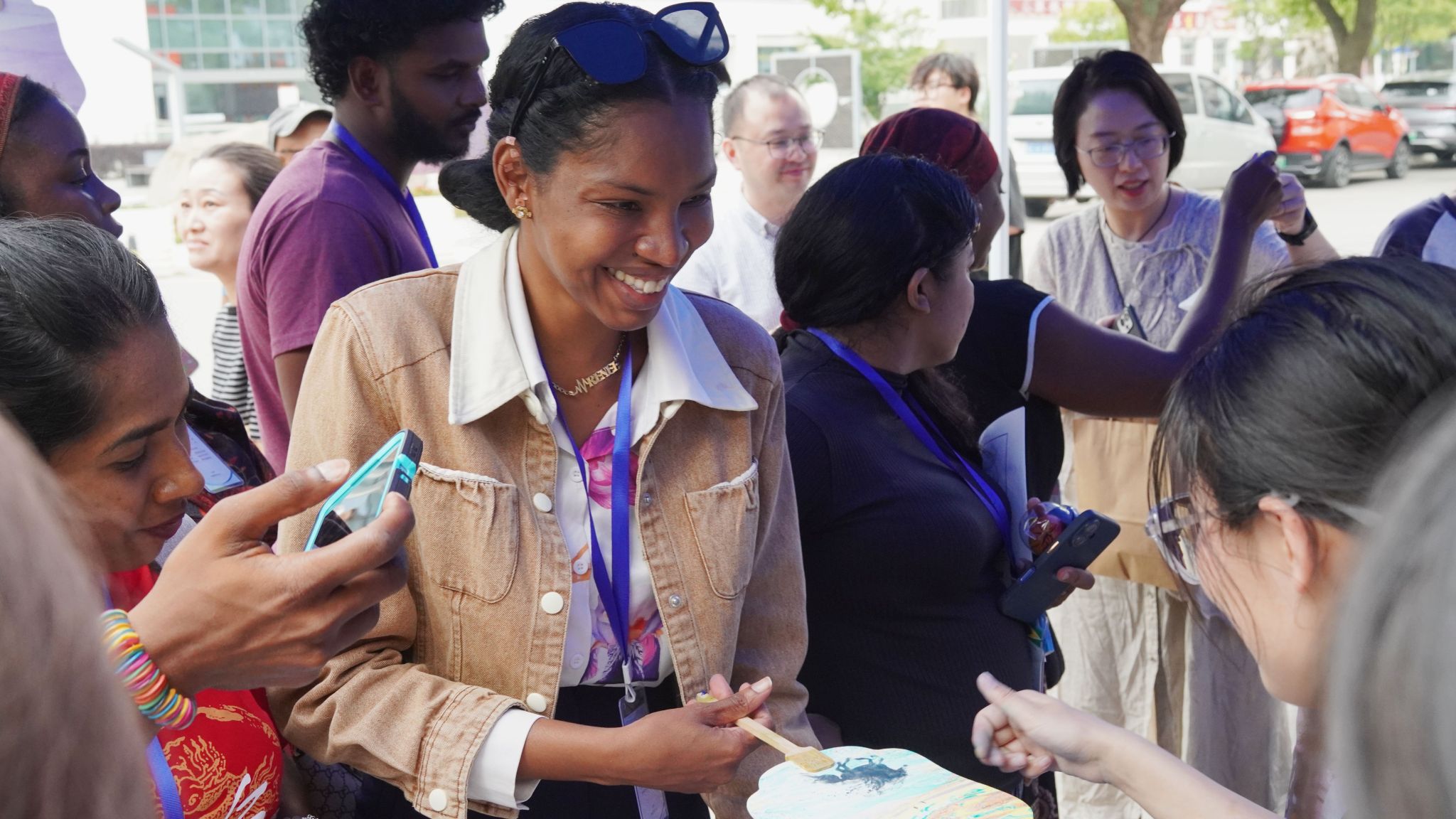 為激發讀者對農耕文化的興趣和思考,探索文脈傳承的創新形式?;顒蝇F場還設有“以題為由,領略中華農耕之奇”的知識競答和“以扇為介,傳遞自然之美”的DIY非遺漆扇等內容豐富的文化活動。知識問答環節,讀者隨機抽取題目,題目涵蓋了農史、農技、鄉村振興等領域的農耕文化知識。師生們充分調動所學所知,沉著應答,展現出了他們扎實的專業功底和人文素養。在非遺漆扇制作區,歡聲笑語,讀者們親手體驗繪制樂趣,感受非遺文化的獨特魅力,打造沉浸式傳統文化閱讀場景。書展現場也吸引了一批不同膚色的國際友人,他們來自圭亞那,因參加農產品加工技術培訓項目到訪交流。適逢書展舉辦,這群遠道而來的客人興致盎然地體驗了中華非遺漆扇制作工藝。漆扇的斑斕色彩不僅暈染出文化交流的獨特韻味,更為中外文明互鑒增添了鮮活注腳。