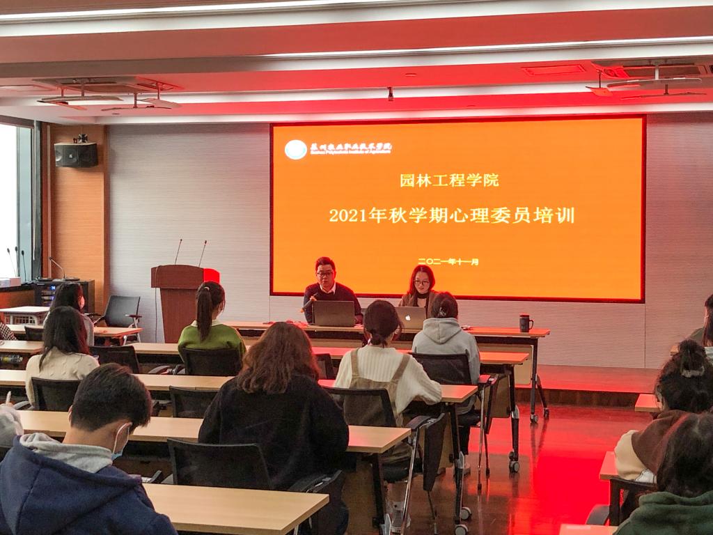為加快推進2021年新學期心理健康工作,強化學生心理健康意識,11月11日下午,在園林技術館227室,園林工程學院針對2020級和2021級各班級心理委員開展心理健康知識專題培訓。我校心理健康教育中心種文浩老師受邀做主題講座,園林工程學院心理專員魏秋江主持。