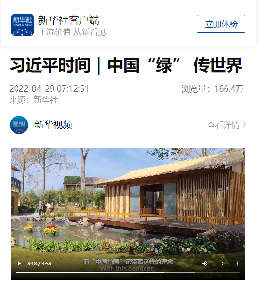 “中國(guó)竹園”在本次世園會(huì)的參展,被看作為中荷建交50周年的一件盛事。人民日?qǐng)?bào)、央視新聞、新華社等媒體爭(zhēng)相報(bào)道。2022年4月29日,“中國(guó)竹園”的精彩場(chǎng)景更是被新華社錄制在“習(xí)近平時(shí)間 ‘綠’傳世界”專題報(bào)道視頻中,瀏覽量達(dá)166.4萬(wàn)。