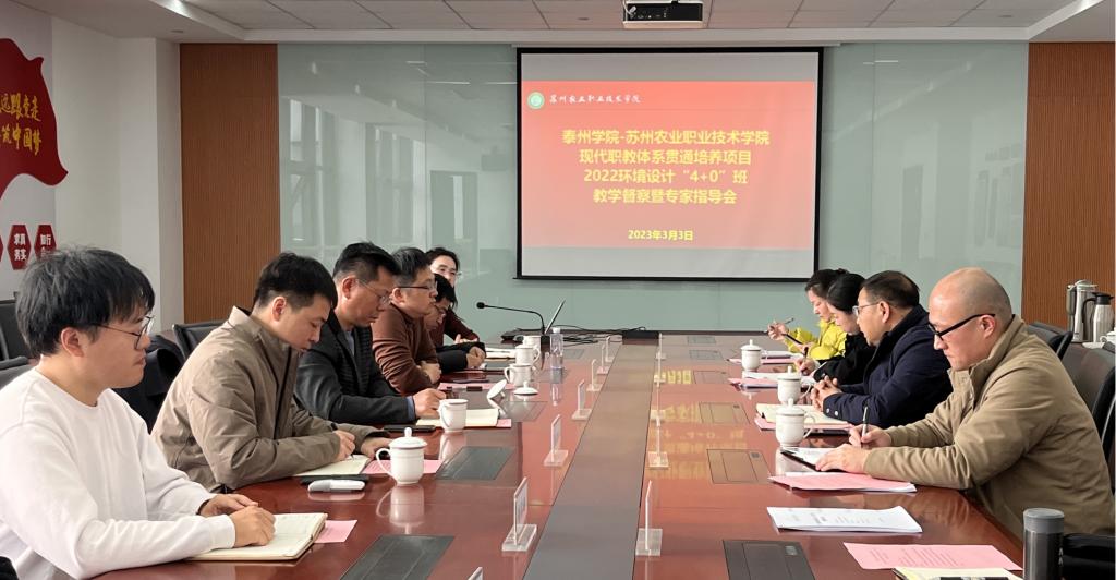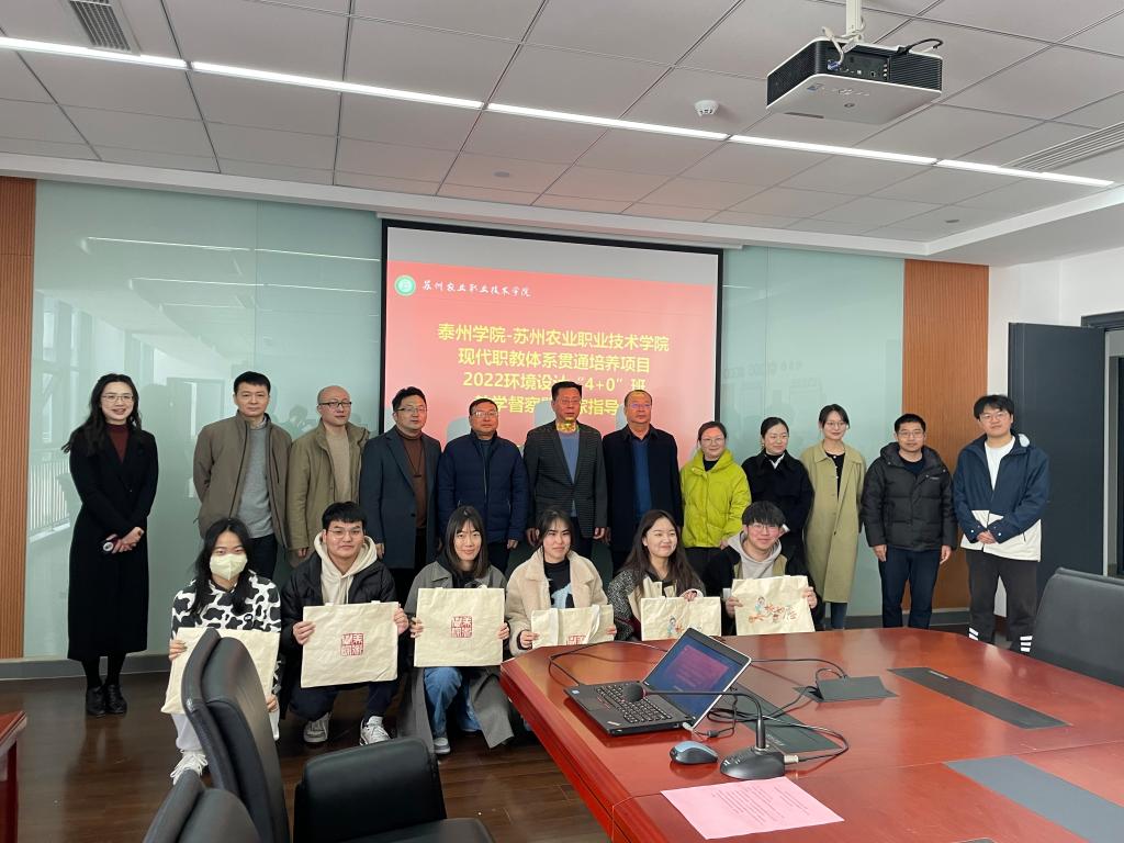 之后雙方舉行了泰州學院-蘇州農業職業技術學院現代職教體系貫通培養項目2022環境設計“4+0”班教學督查暨專家指導會。會上,周軍副校長首先對蔡處長一行表示熱烈歡迎,并從學校歷史、辦學特色、人才培養、辦學成果等方面對學校進行了介紹。鞠鵬杰副院長就2022環境設計“4+0”班級教學秩序,人才培養方案執行情況以及后續培養特色進行了匯報。蔡俊處長代表交流檢查組講話,對我校2022環境設計“4+0”班級的培養模式與培養成果表示充分的認可,并表示今后要將加強雙方在教學、科研等多方面的交流與合作。