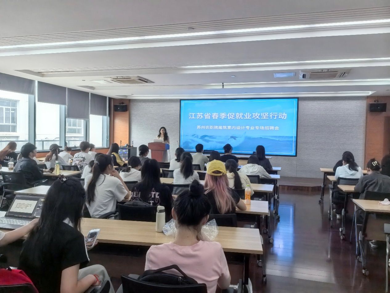 6月19日上午,園林工程學院建筑室內設計教研室于園林技術館227多功能廳,成功舉辦“春季促就業攻堅行動”建筑室內設計專業專場招聘會。蘇州推山設計咨詢有限公司、蘇州生活家裝飾受邀入校招聘宣講,招聘會由專業負責人肖瑤主持,學院就業專員江奕老師、建筑室內設計專任教師及學生共同參與。